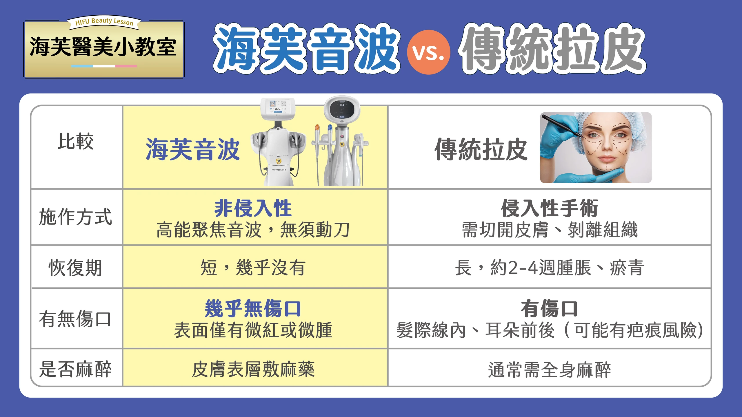 - 傳統拉皮手術: 雖能大幅拉提,但需動刀、麻醉且傷口恢復期漫長,術後表情可能顯得僵硬、不自然。